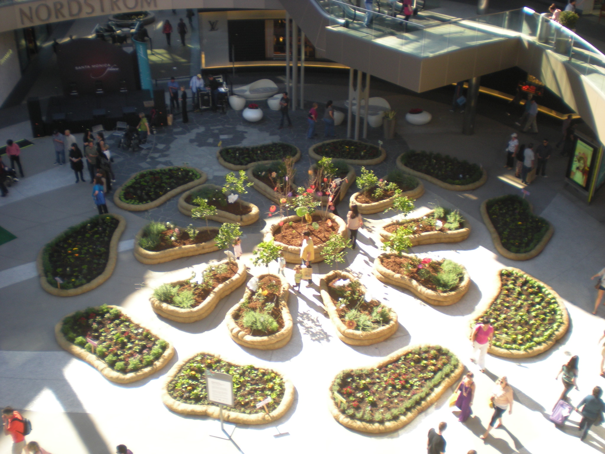 Portable Park lV – past, present, future = A Living Library by Bonnie Ora Sherk opened on January 29 at Santa Monica Place in Santa Monica, CA. as part of The Getty Public Art & Performance Festival and PST. This multi-sensory, living sculpture landscape, replete with sounds of singing birds and crickets, served as both metaphor and actual design in the shape of The Flower Unfolding. The fragrant piece, viewed from above or from ground level had multiple evergreen and deciduous fruit trees, rose bushes, herbs, vegetables, and flowers.