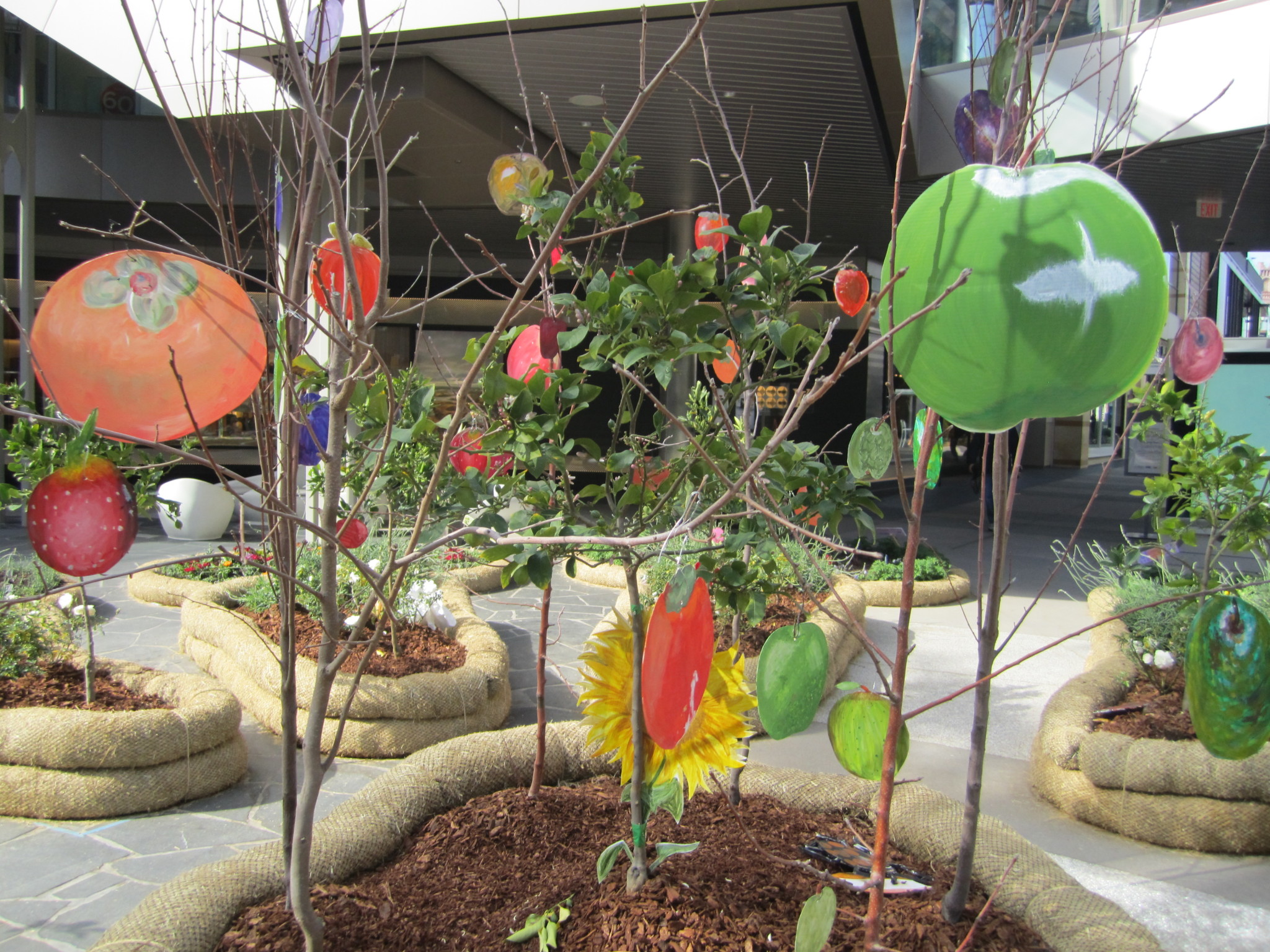 The piece which was an update from the original work, Portable Parks l – lll from 1970, was developed in conjunction with the MFA Public Practice Program of Otis College of Art & Design, and Karen Moss, Curator and Acting Chair of Otis. High School Students from the Crossroads School of Arts and Sciences led by Pam Posey made beautifully painted fruits and flowers that were added to the bare branches of the deciduos fruit trees and rose bushes and labels for the Herb Lanes.