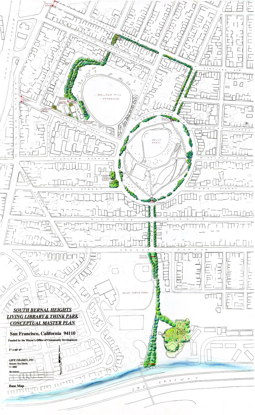 A Community Master Plan for the Bernal Heights Living Library & Think Park Nature Walk was developed by diverse community participants including children, youth, and adults, led by Life Frames, Inc. and Bonnie Ora Sherk, in 2002-03, funded by Mayor’s Office of Community Development and San Francisco Foundation. Trees were planted by school children, neighbors, volunteers from Salesforce, One Brick, Jewish Community Federation, with great help from Recreation & Park, Department Public Works, Housing Authority, SF Public Utilities Commission. According to Karen Huggins, Public Housing Development President of Holly Courts’ Resident’s Council, “The Living Library Nature Walk that will eventually frame the Islais Creek Watershed is more than just a nature walk. It is a bridge connecting the whole community together with the same visions for the future, making a connection daily as we walk by each other.”