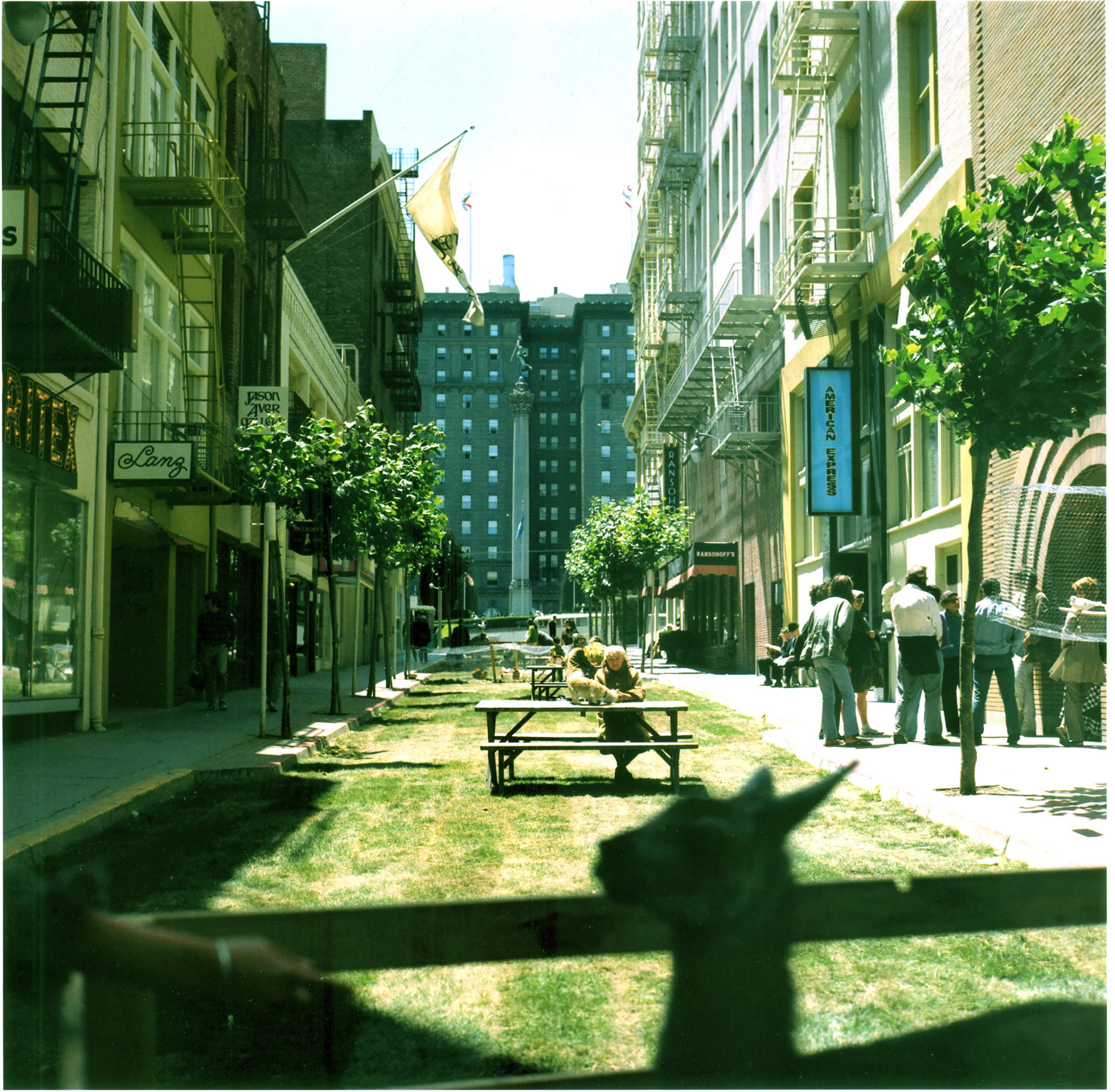 Portable Parks l - lll, won the 1st SECA Vernal Equinox Award that year, and for four days the performance installation moved to three sites in San Francisco: the former James Lick Freeway that crossed over Market Street; two concrete islands adjacent to the Mission/Van Ness Offramp; the whole street of Maiden Lane between Stockton and Grant.