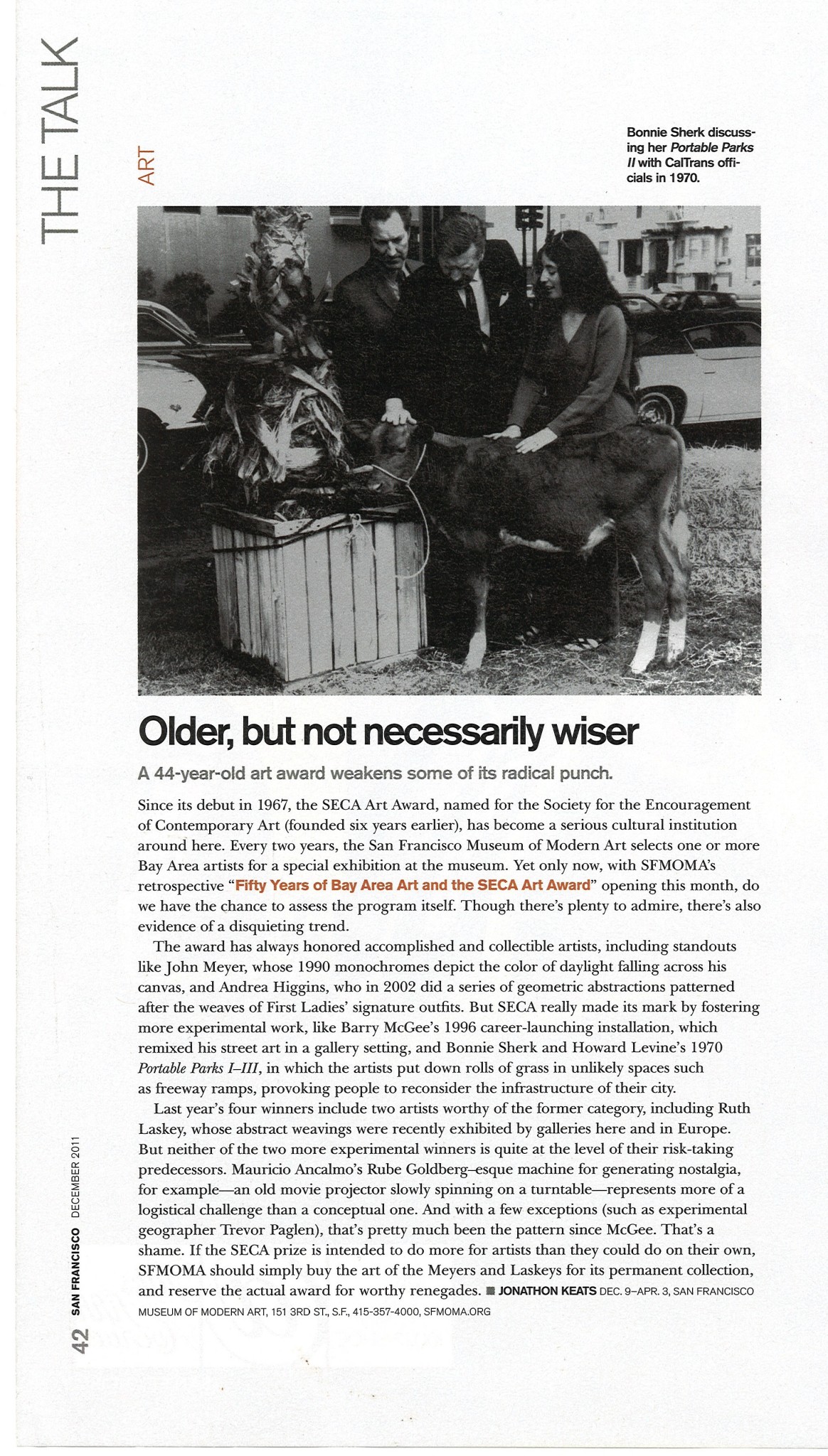 Portable Parks l - lll (1970), an early artwork by Bonnie Ora Sherk, (with Howard Levine), that transformed three barren, sterile, urban "dead spaces" into green, living environments replete with sod, palm trees, and live animals is being featured in an exhibition at the San Francisco Museum of Modern Art. The show, Fifty Years of Bay Area Art and the SECA Art Award, opened on December 7 and continues through April 3, 2012.