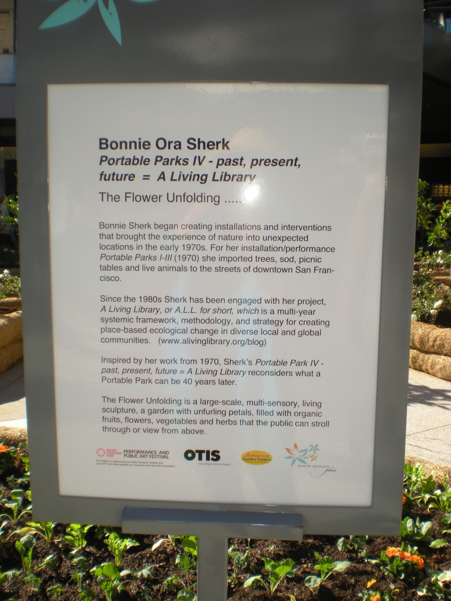 Sherk's new work, Portable Park lV - past, present, future = A Living Library, in conjunction with Otis College of Art & Design, the City of Santa Monica, Maserich, and featured in the Getty's Performance & Public Art Festival will open at Santa Monica Place in Santa Monica, California on January 27 - February 4, 2012. View link on The Getty's PST Website: Portable Park lV - past, present, future = A Living Library