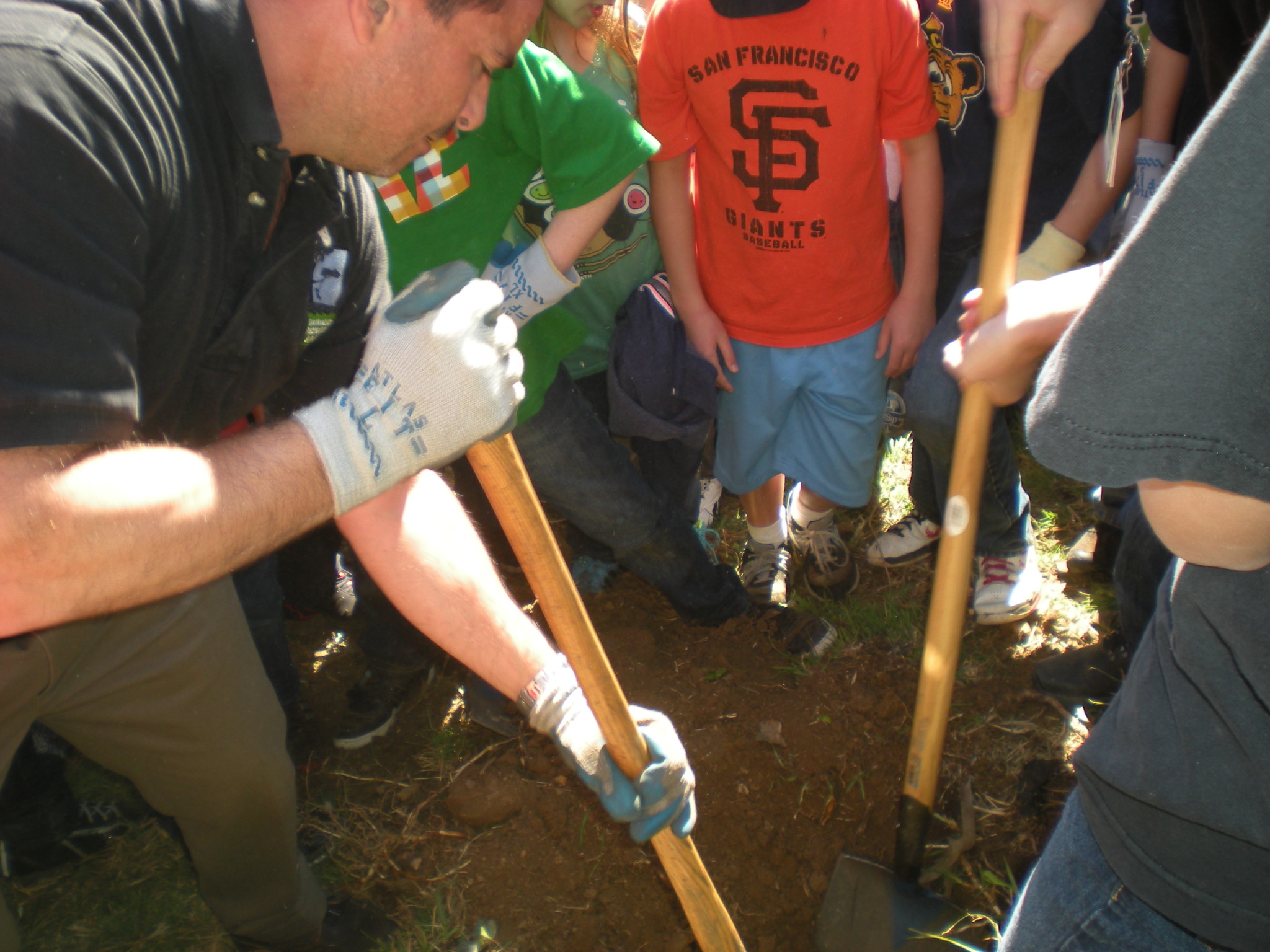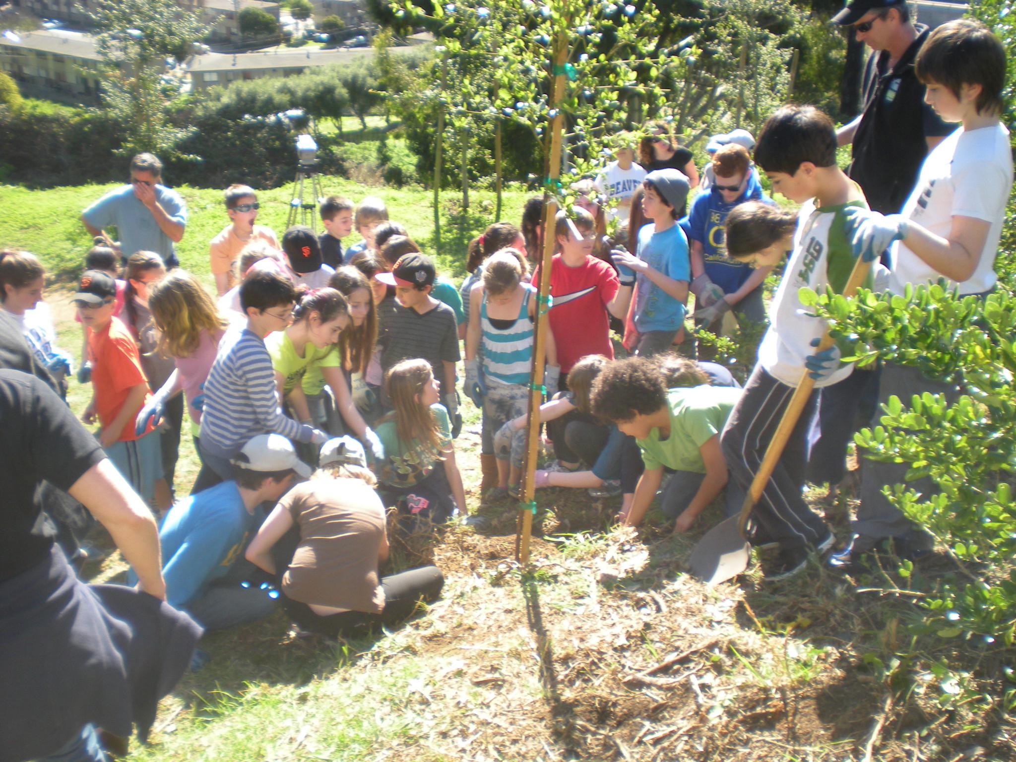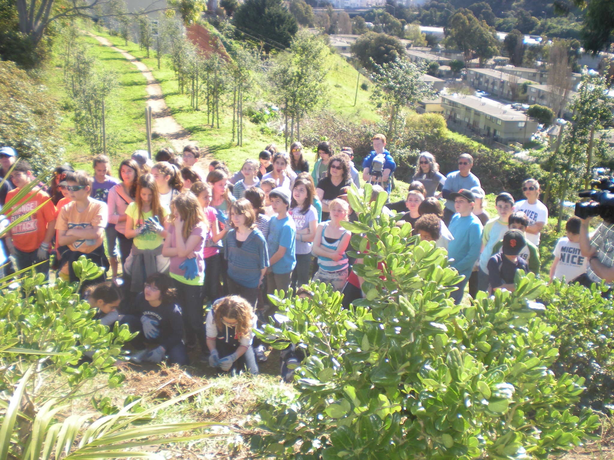 The Bernal Heights Living Library & Think Park Nature Walk celebrated a milestone on February 23 in St. Mary's Park with the planting of the 500th California Native Tree in the local parks by Phil Ginsburg, General Manager of SF Recreation and Park Department. Brandeis Hillel Day School 6th grade students, Founder & Director of Life Frames, Inc. & A Living Library, Bonnie Ora Sherk, the sponsor and designer of the Bernal Living Library Nature Walk, and funder of the project, California Department of Forestry and Fire Protection's, Glenn Flamik, planted additional trees in the park and all participated in the joyous 500th Tree Planting Ceremony.